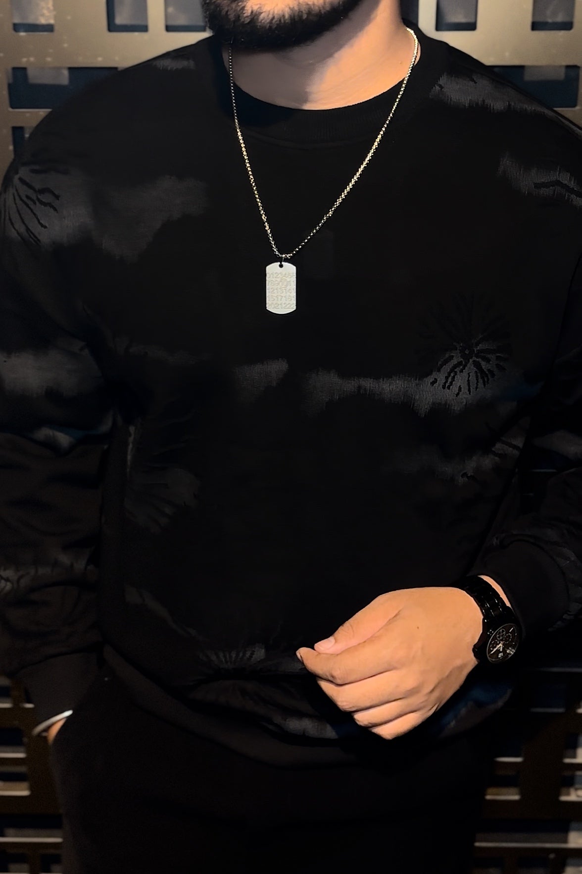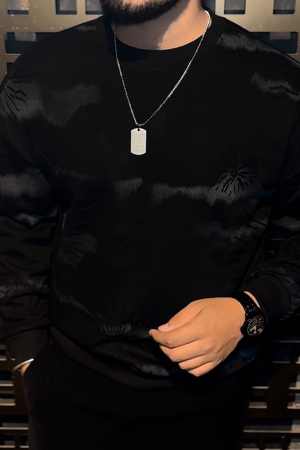 Design: Luxurious black sweatshirt with an abstract pattern embellishments.