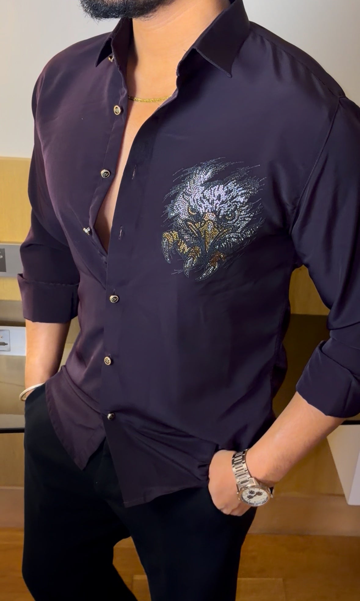 Crafted from premium fabric with a smooth, stitch-free finish, the shirt offers a sharp silhouette and elevated comfort. The subtle shine from the stonework catches light effortlessly, making it perfect for parties, celebrations, and standout evenings.