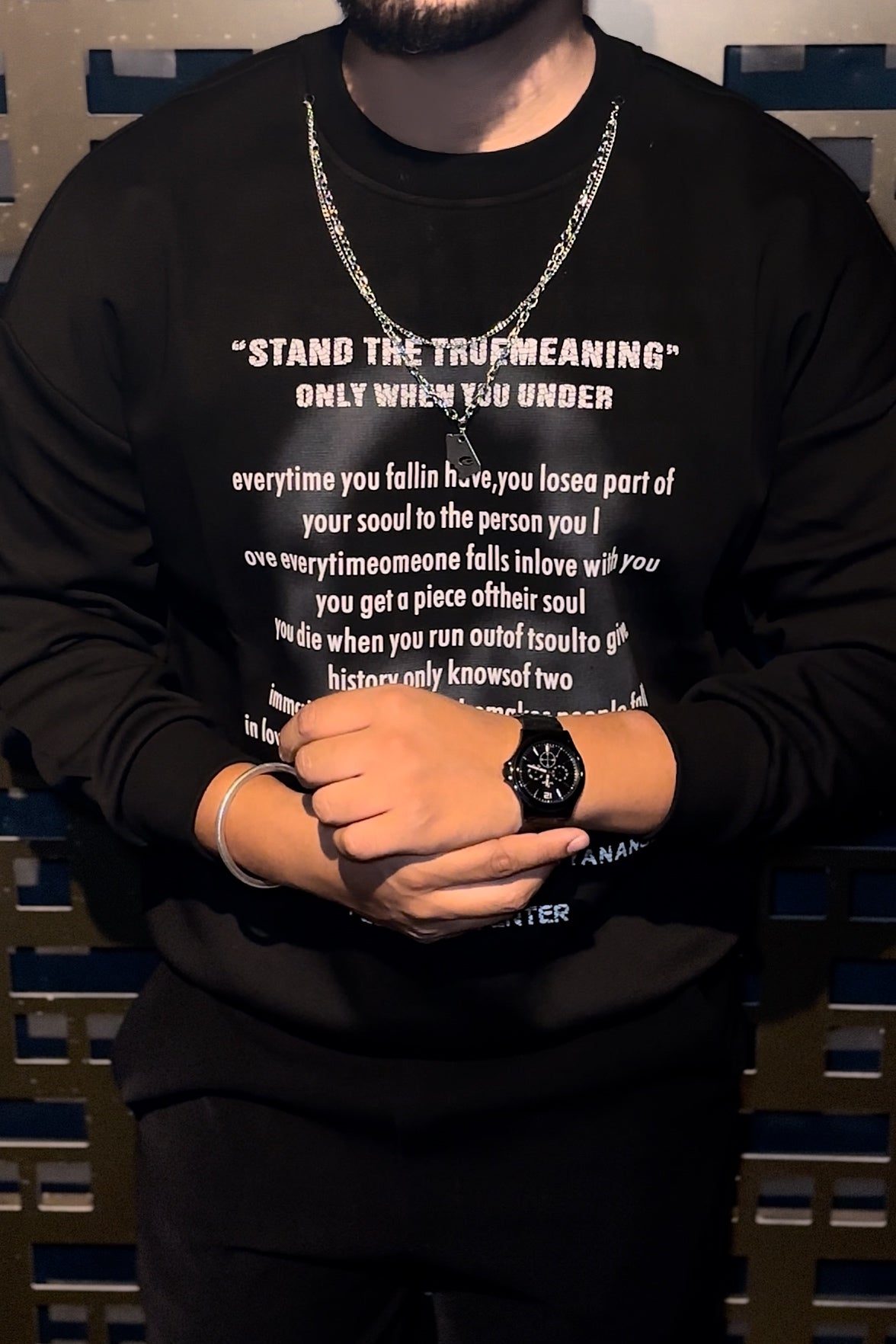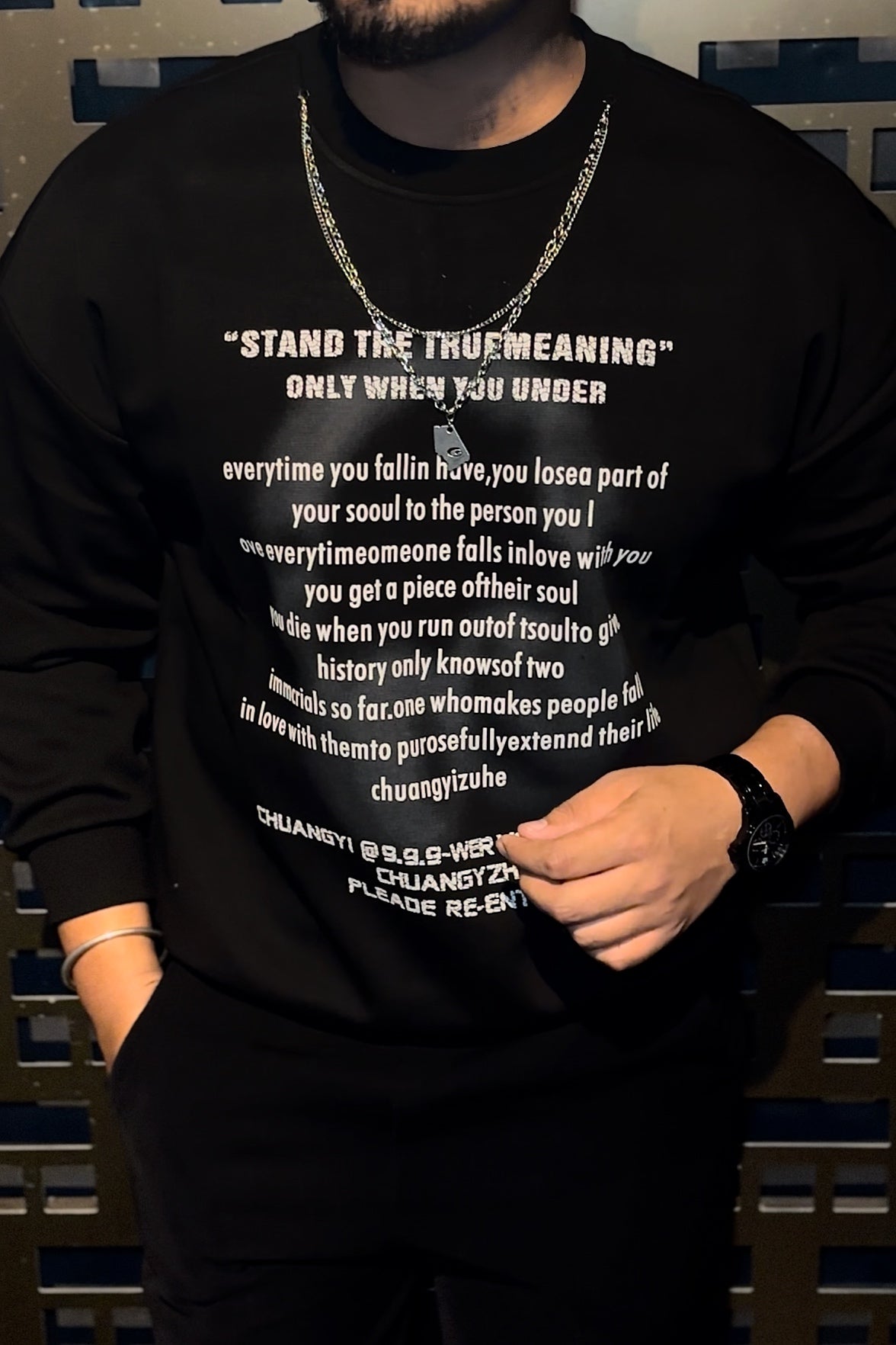 Design: Luxurious black sweatshirt with an abstract text pattern.