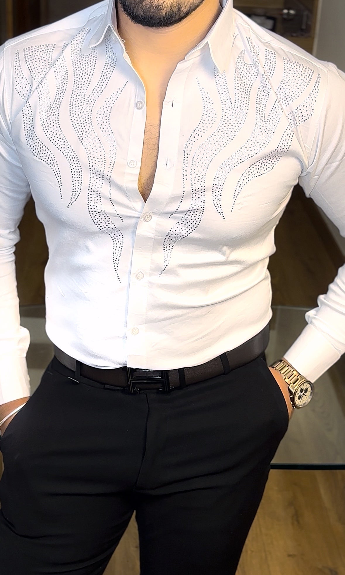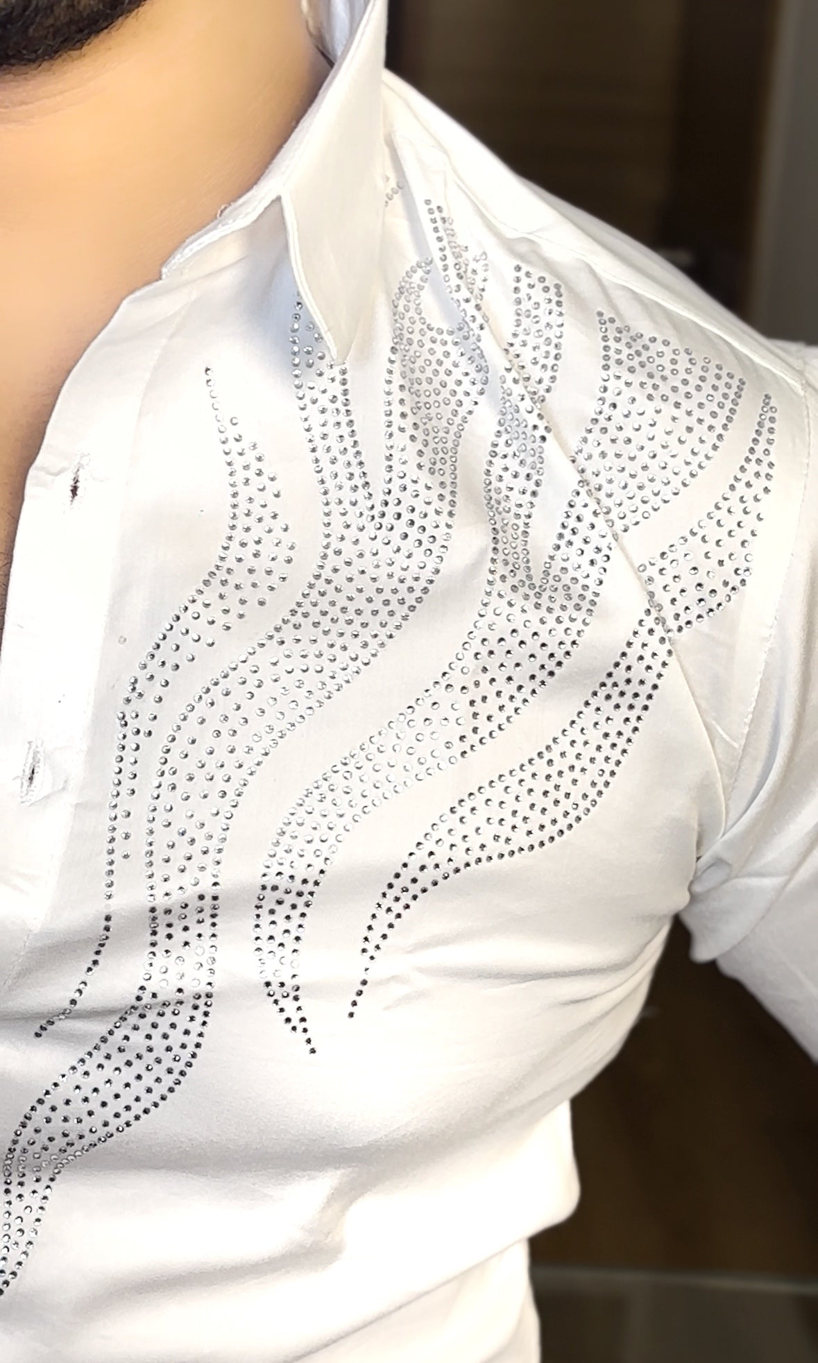 Unleash your bold side with the Under Attack NawaabZaade Premium Shirts Collection, featuring a dazzling Swarovski-inspired work that redefines sophistication. Crafted from ultra-premium fabric, this shirt offers unmatched comfort with a touch of luxe shine.