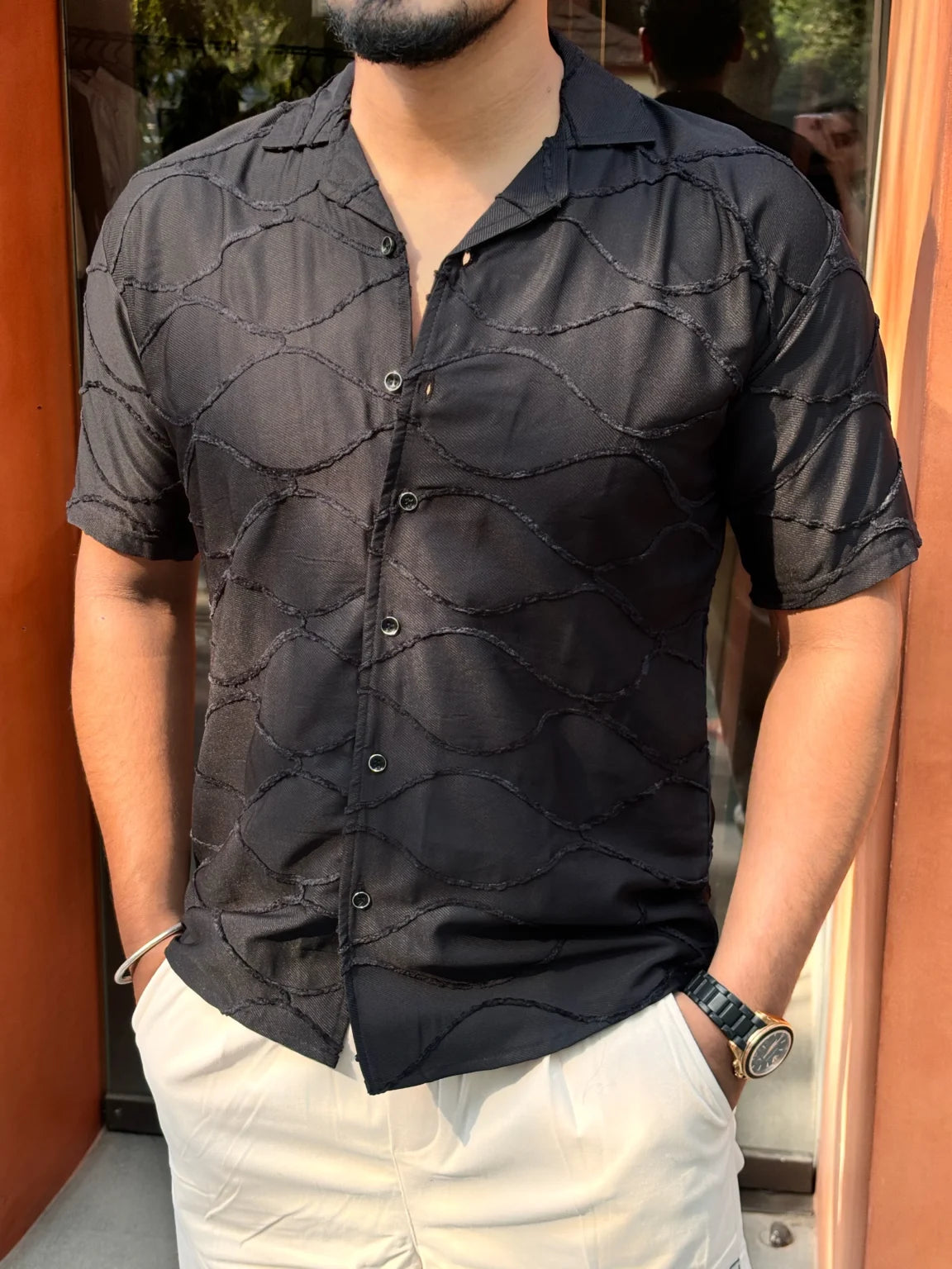 Let’s get you coordinated. Elevated design with embroidery detailing. This Co-Ord Shirt features embroidered details on the garment, adding a refined touch to a classic silhouette. The Cuban collar and button-up front, while the regular fit ensures a sharp and tailored appearance.