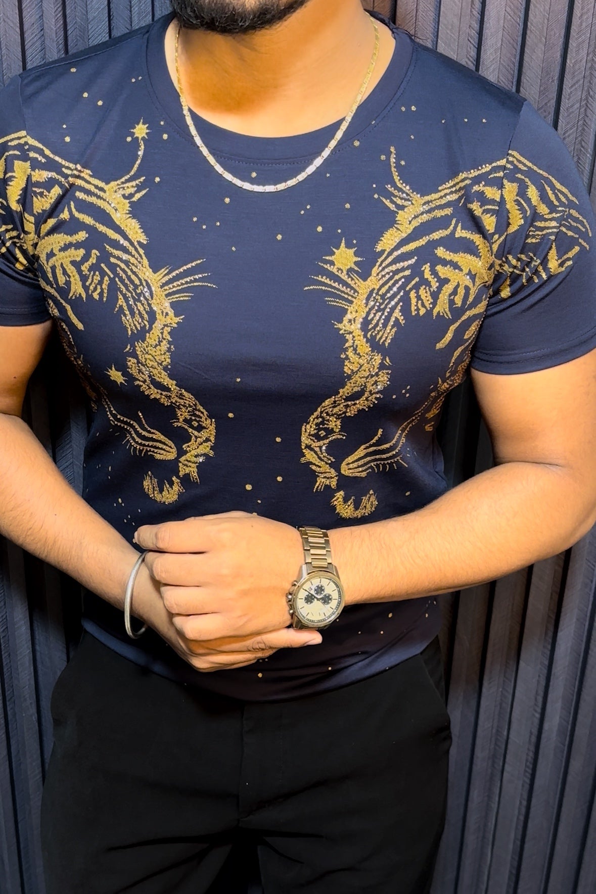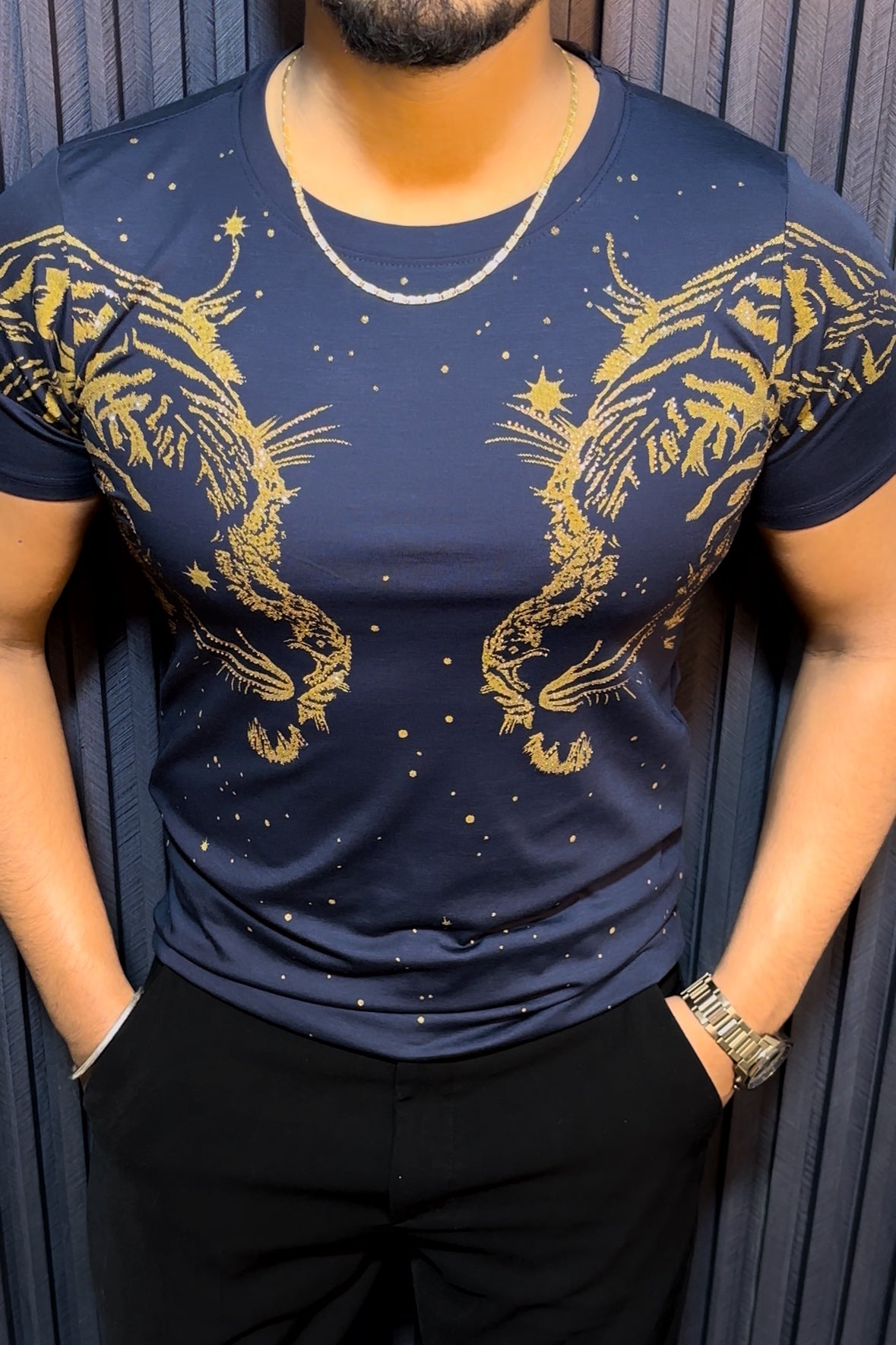 Tiger Double Face Half Sleeves Tshirt - Navy