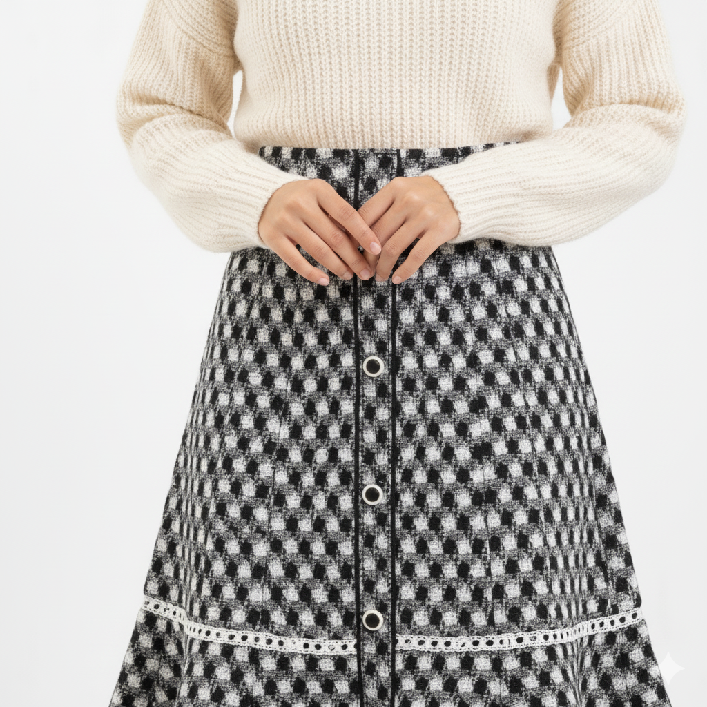 Where timeless elegance meets winter warmth. This tweed pleated skirt is designed to be your go-to statement piece for the season—structured, versatile, and effortlessly chic.