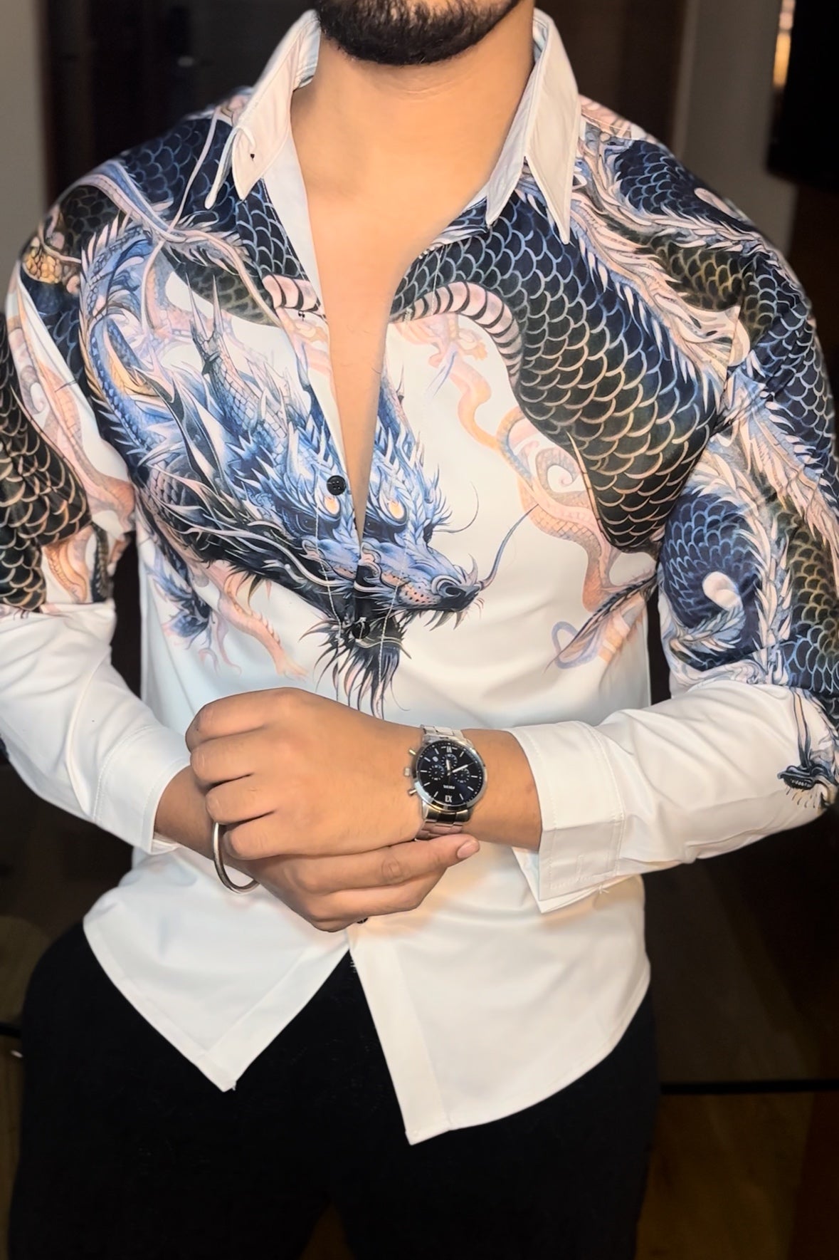 Design: Luxurious shacket with a digital print abstract pattern embellishments.