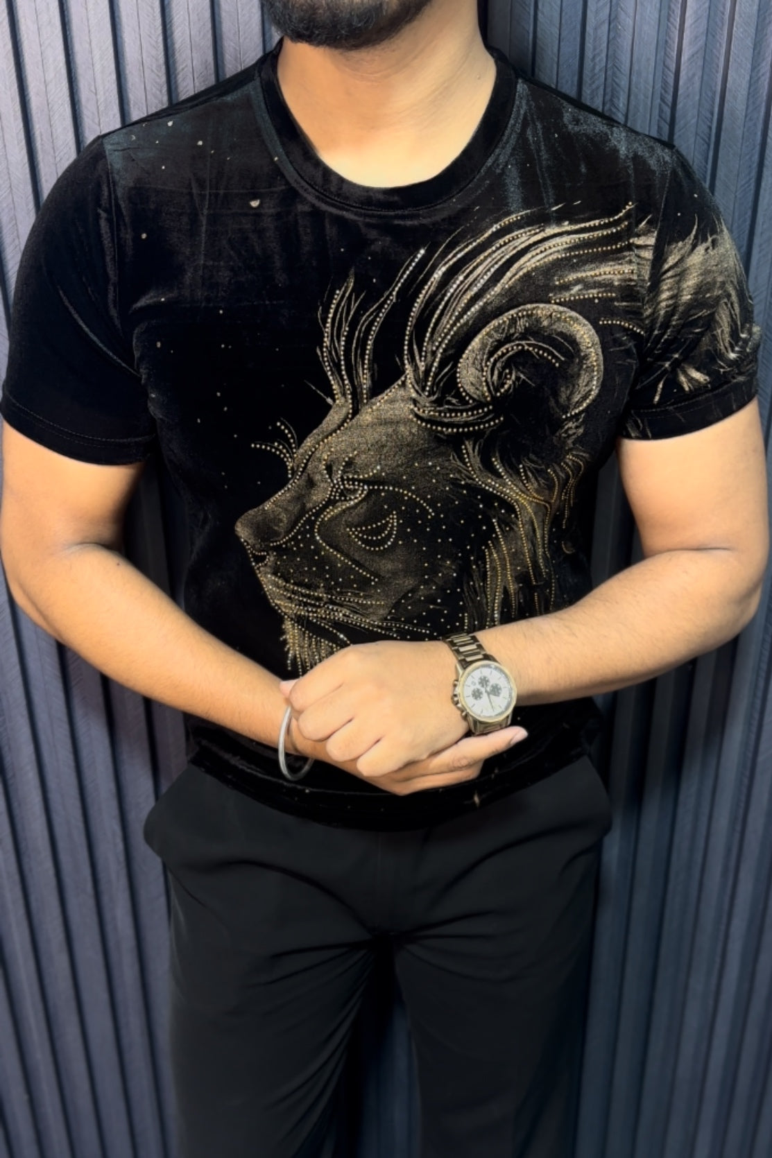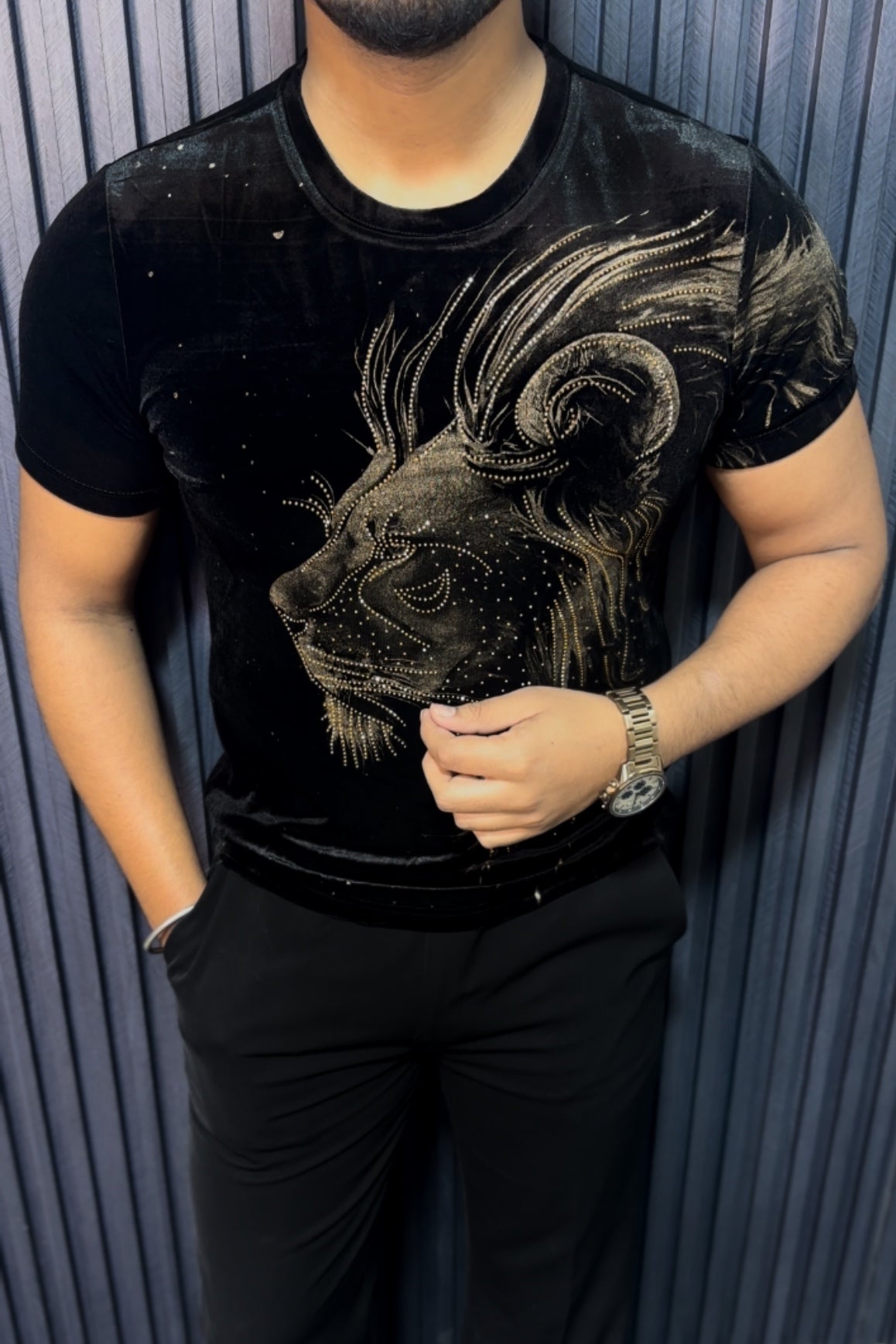 Velvet Swarovski Lion Side Face Gold Half Sleeves Tshirt - Black